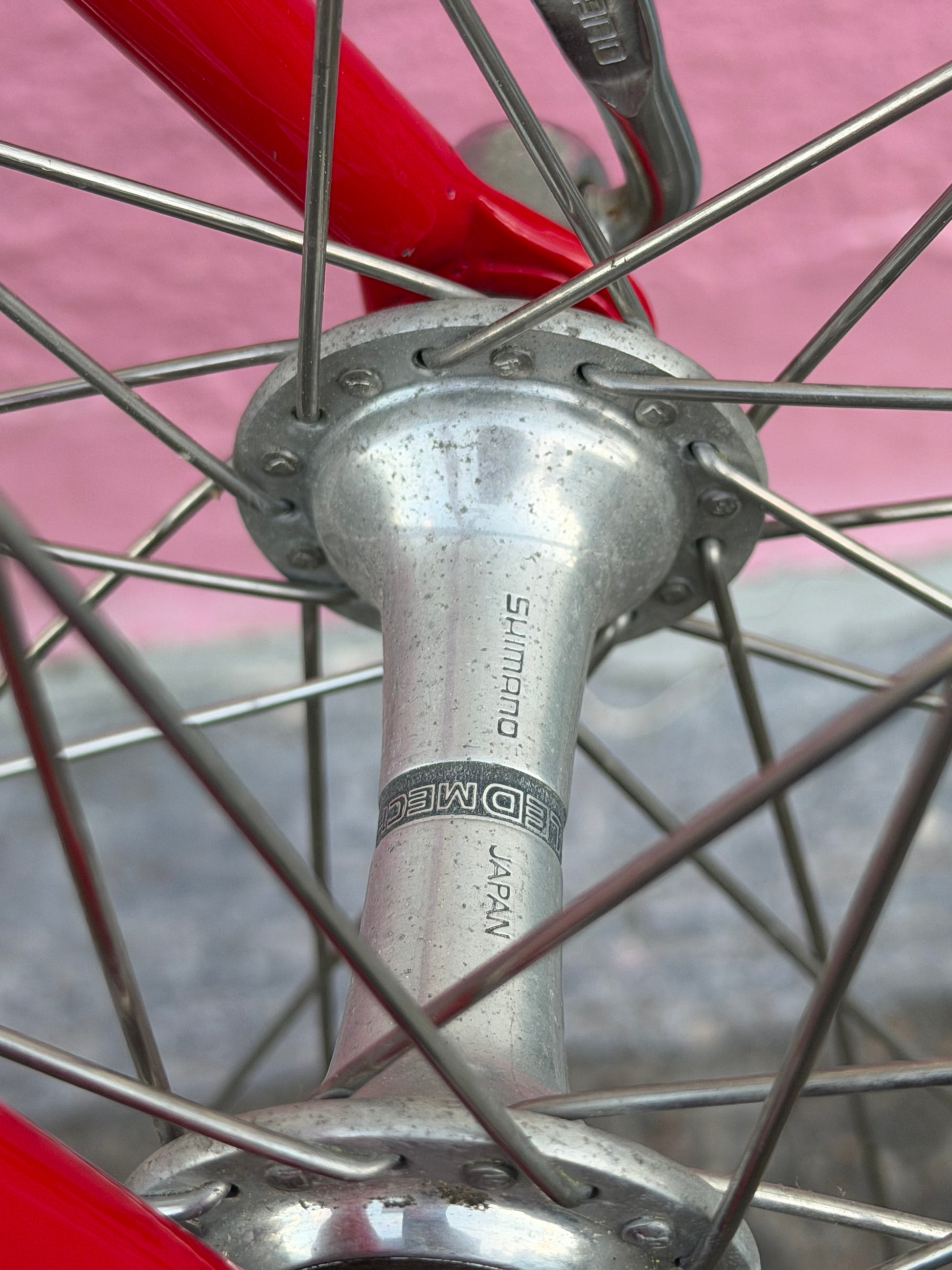 A beautiful garaged Bob Jackson road bike on consignment. Reynolds 531 tubing frame and fork, Shimano 600 pre-index 2x6 speed group (including the scallop headset!), Mavic rims. It’s got some dings and wear from 40 years of riding and cross country moves and garage storage. It’s still a beaut.