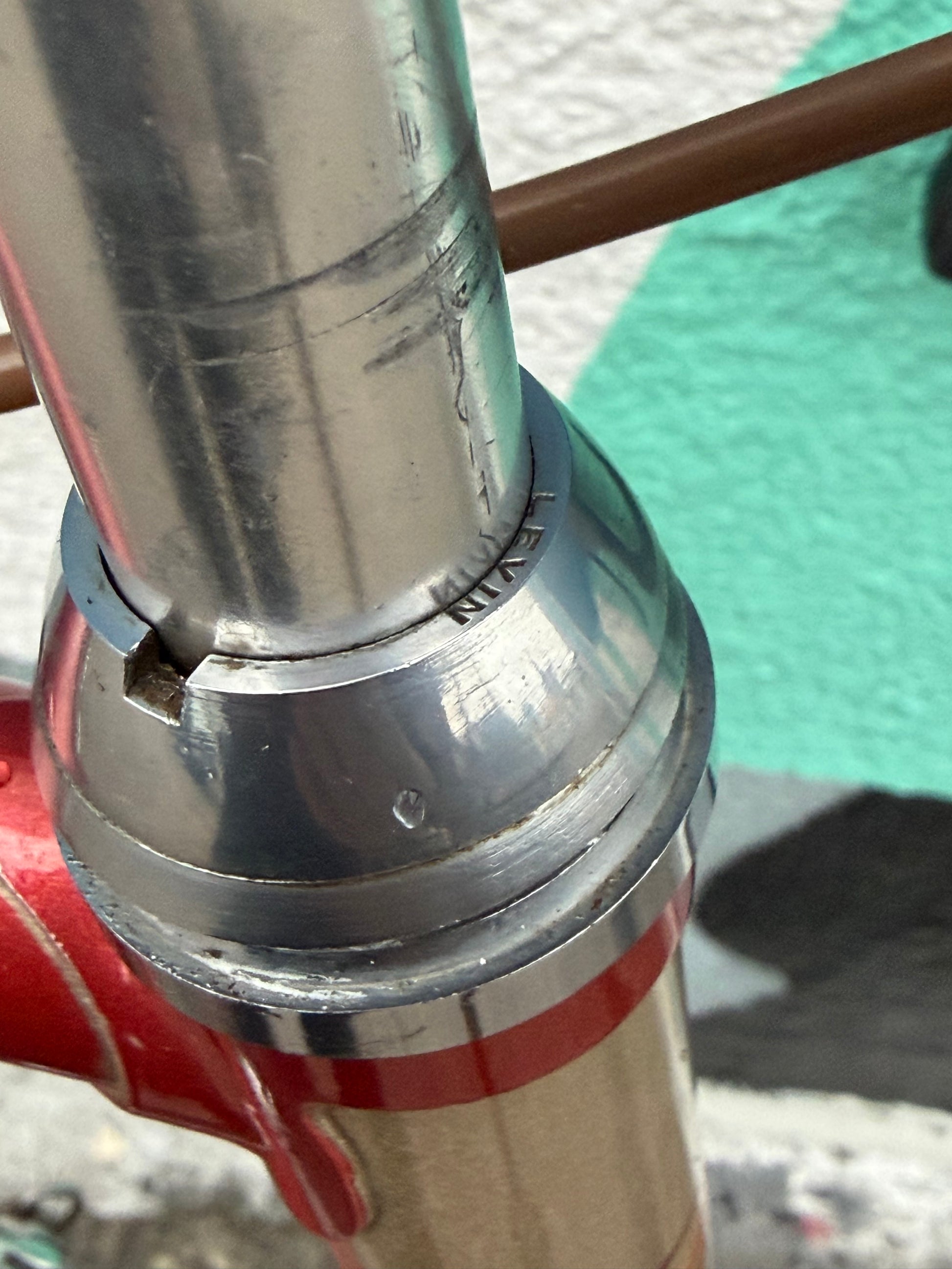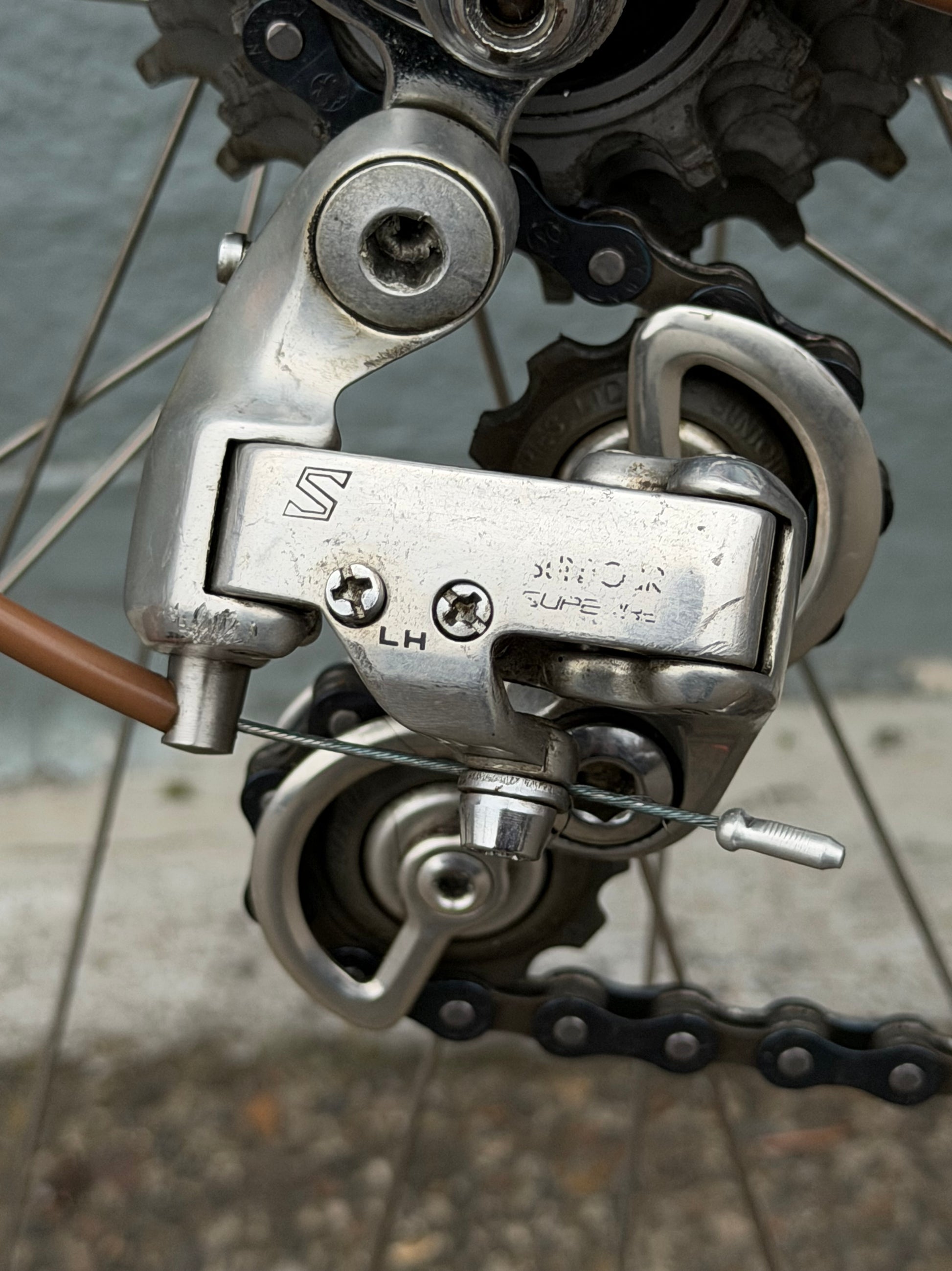 Sugino Aero Mighty crankset, Suntour Cyclone downtube shifters and derailleurs are in good shape. Dia Compe single pivot brake and levers in a bronze anodizing to match the burnt orange color of the frame.