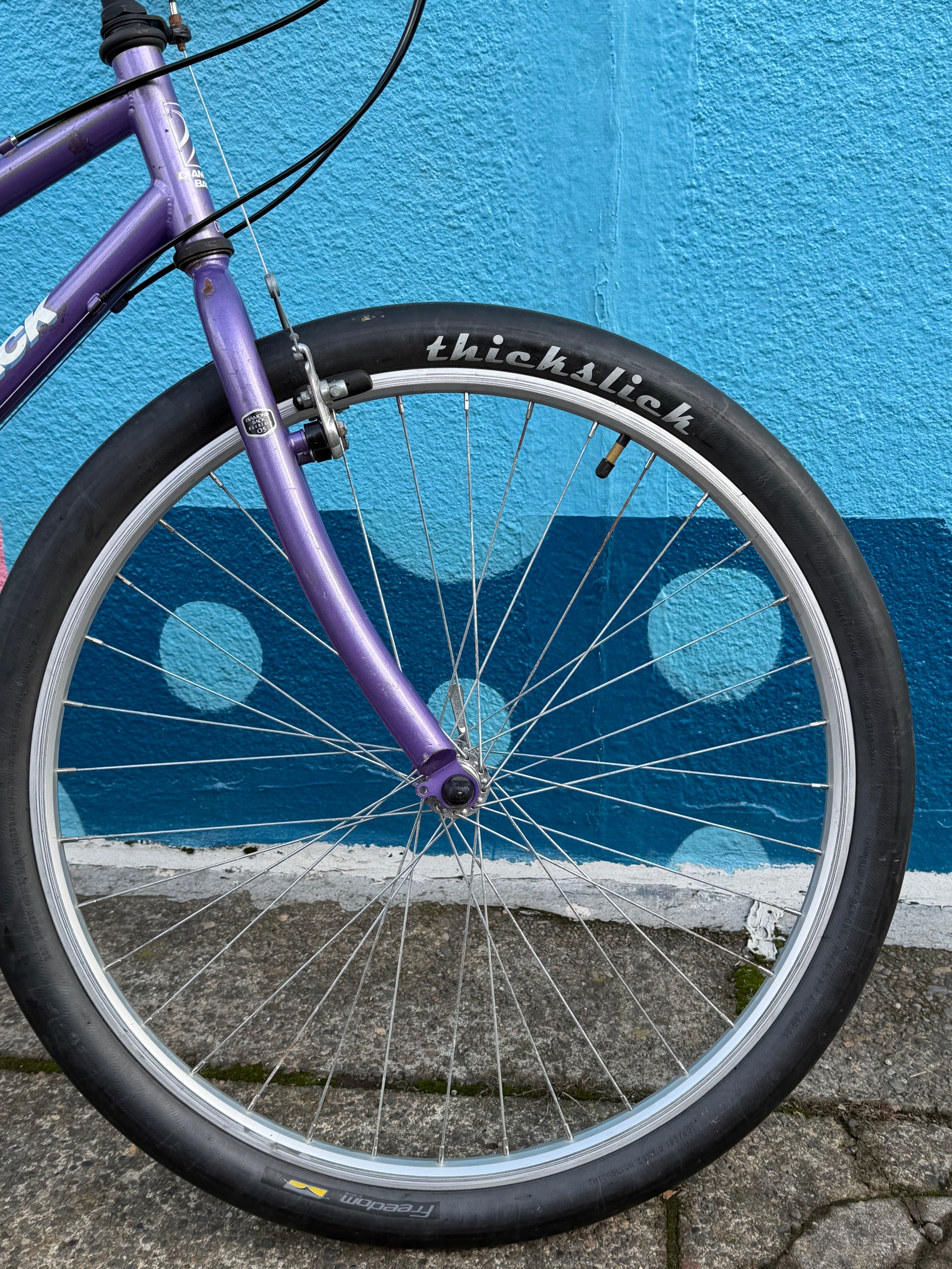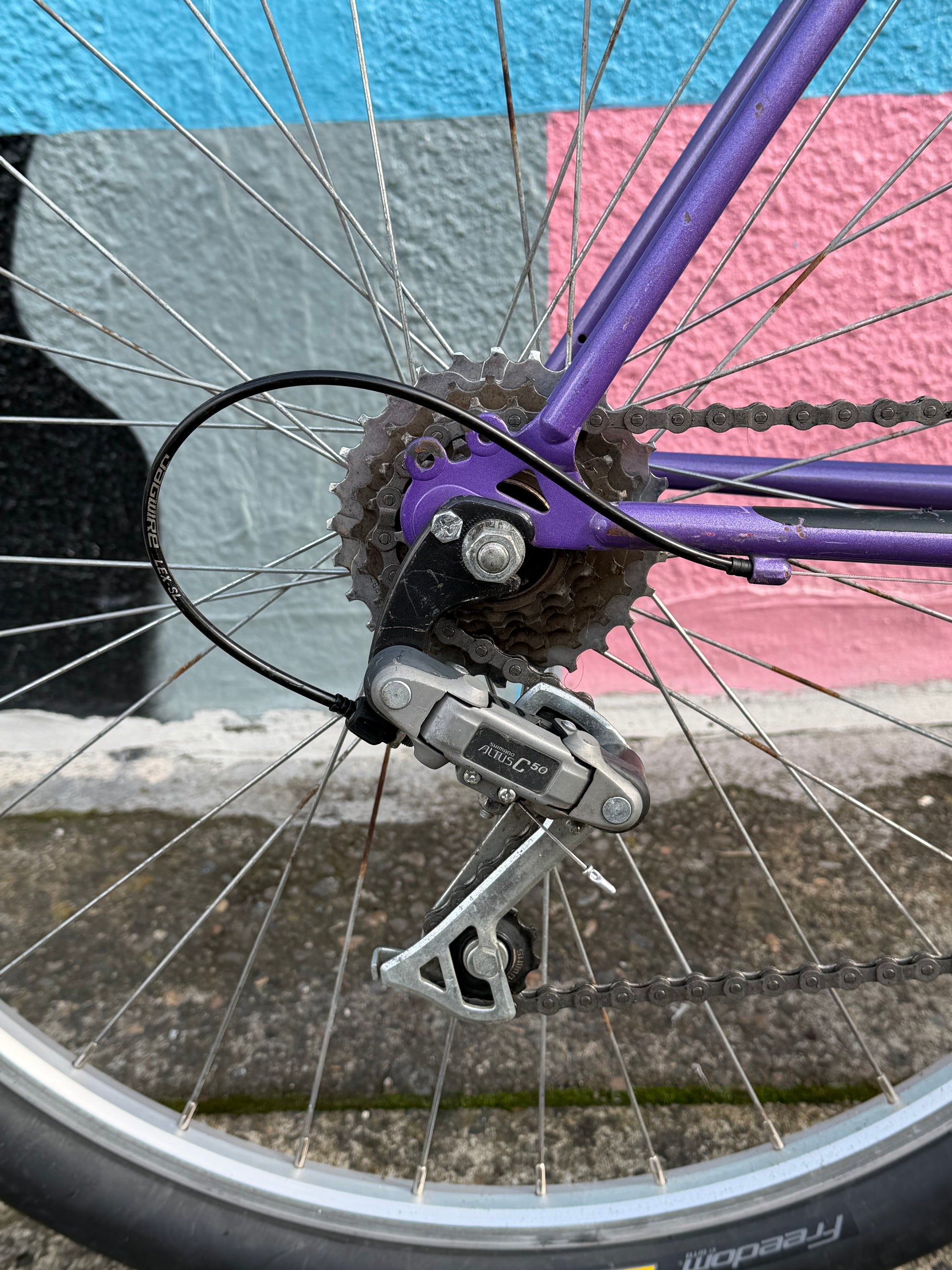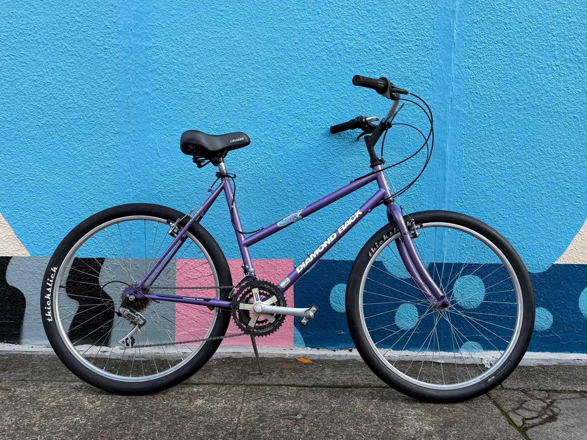 The purple purple is back. Big fat tires and step thru frame action. 18 speeds and fluffy saddle with backsweep bars for getting to your next social. Keeping it cheap for the kidz and students.
