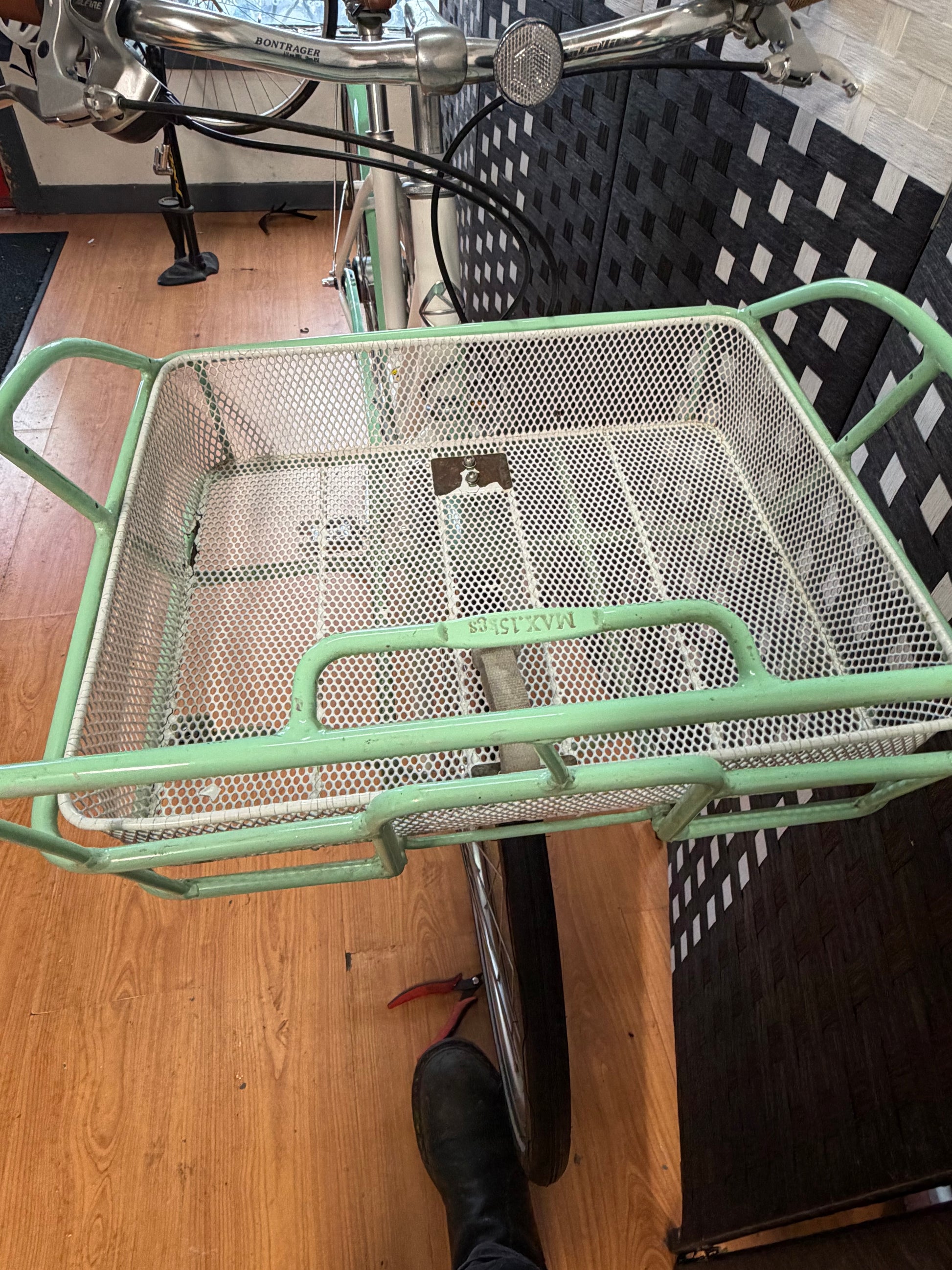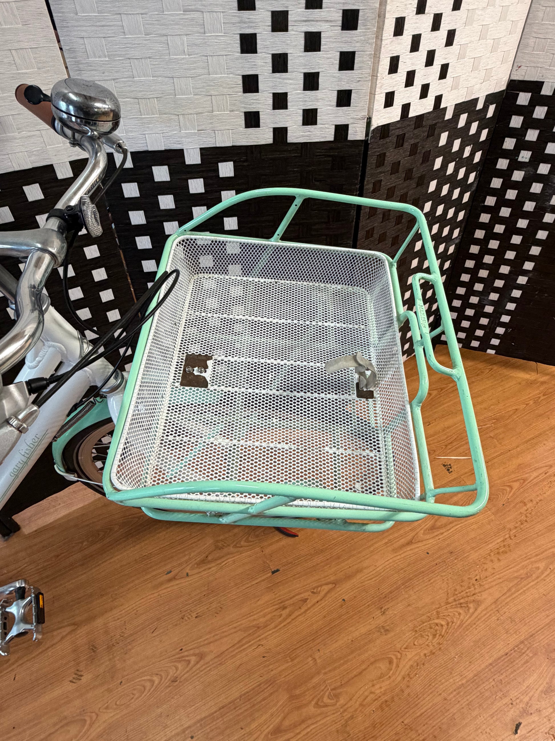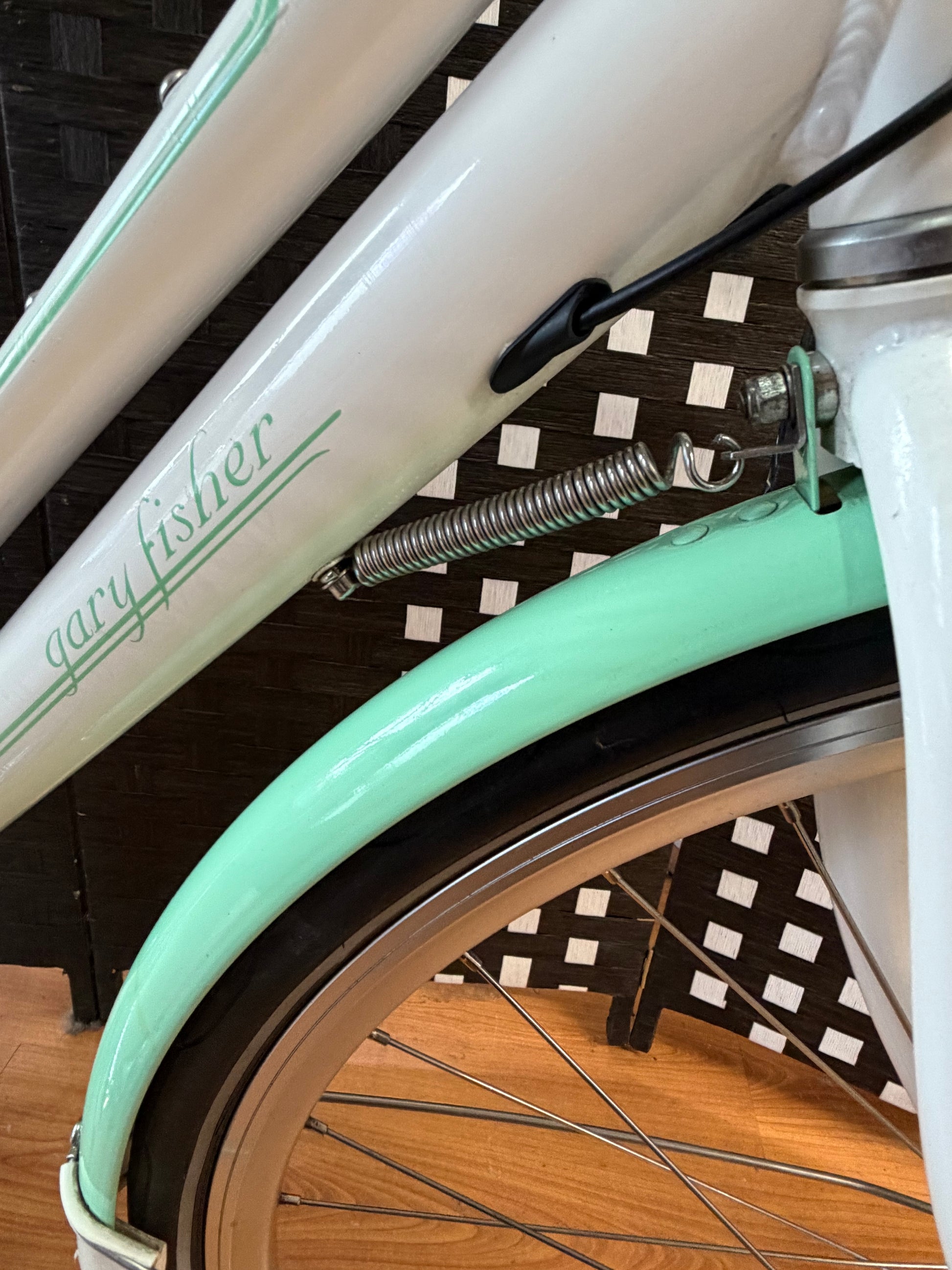 A celeste and soft white Gary fisher Simple City basket bike in great shape! This is the ultimate city bike. Step thru low entry frame style is ideal for getting around town. Original front basket and full coverage fenders are included. Speced with a Shimano Nexus 8 speed IGH and Nexave rear roller brake. Brown grips and saddle are great comfortable color accents.