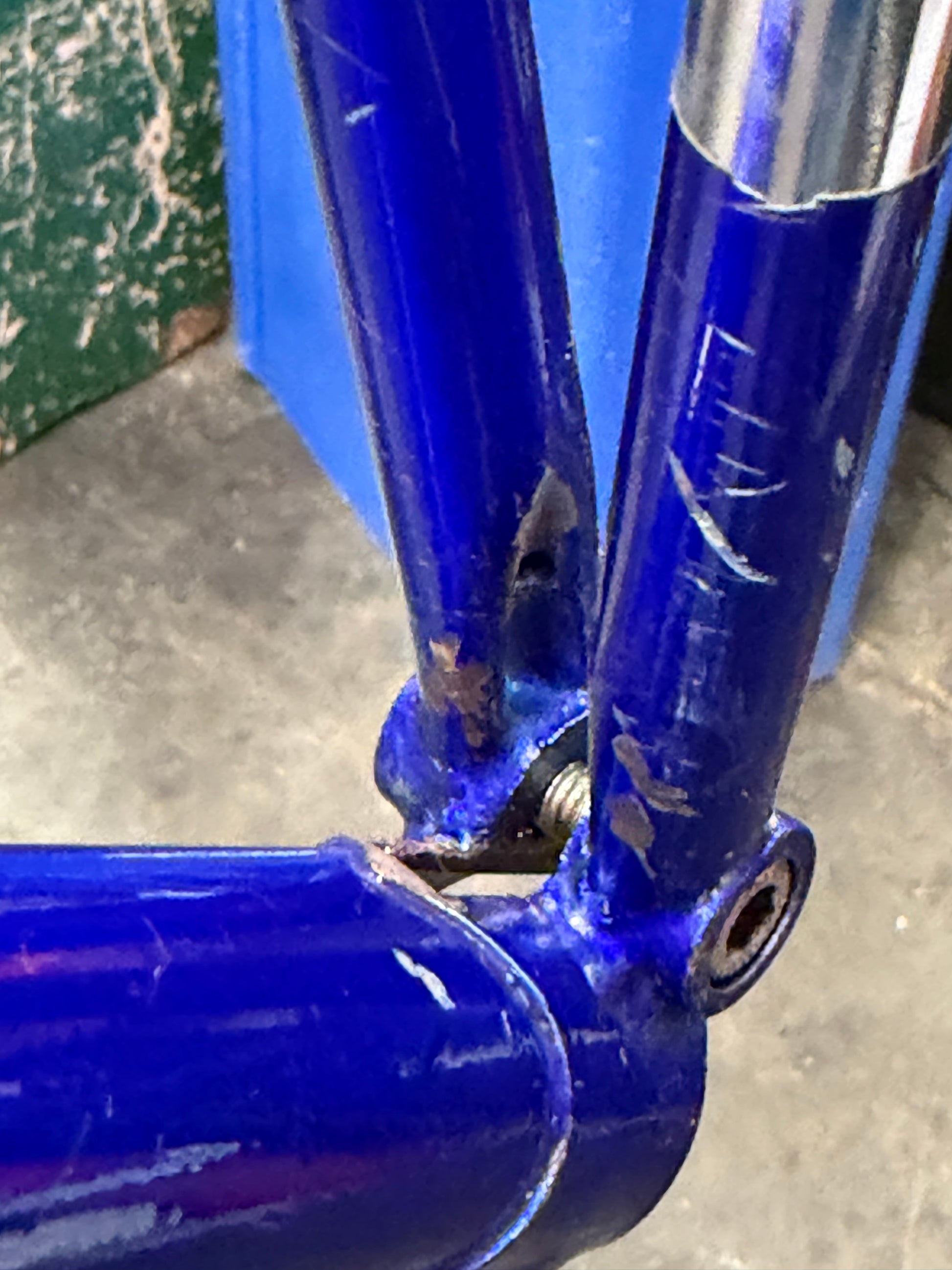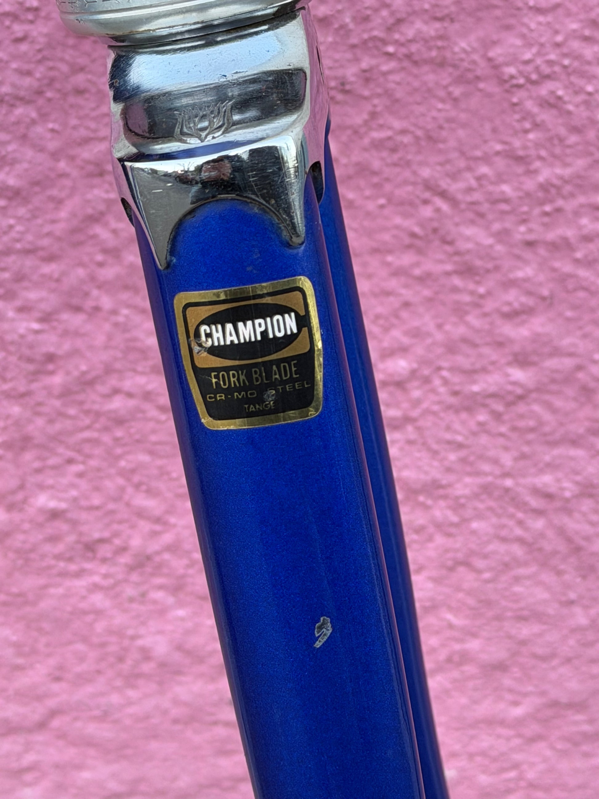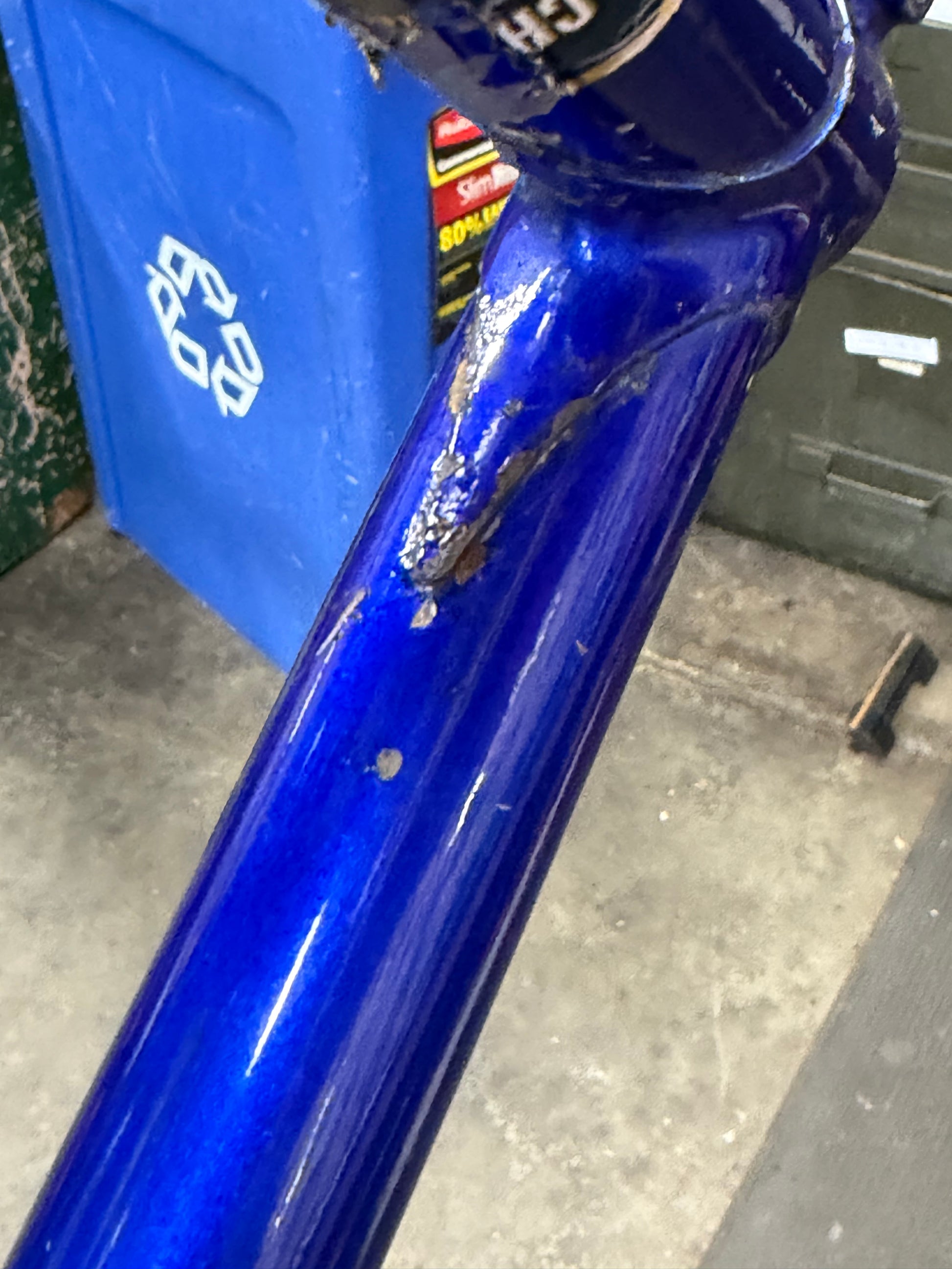 Decals are pretty beat up. Replacement decals for this model are widely available for $50. The paint finish is still the bright electric blue but has scratches typical of a well loved frameset on pavement and in garages since 1984. See photos for conditions.