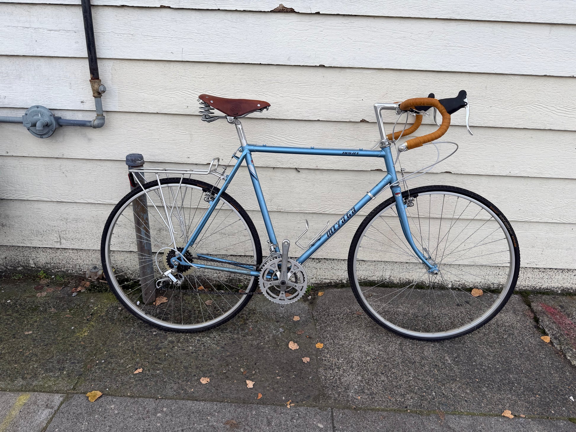 The Miyata 1000 touring bike gets a lot of attention. They are hard to come by and are expensive to restore when you do come across them in well used condition. This is the 210, a more budget friendly spec, and built with a lot of the same stuff you see on more modern bikes like a Crust or Surly if they still made rim-brake models. Nitto Technomic 225 stem and Noodle bars, shellacked and tied bar tape, springer leather saddle, Continental Ride Tour tires.