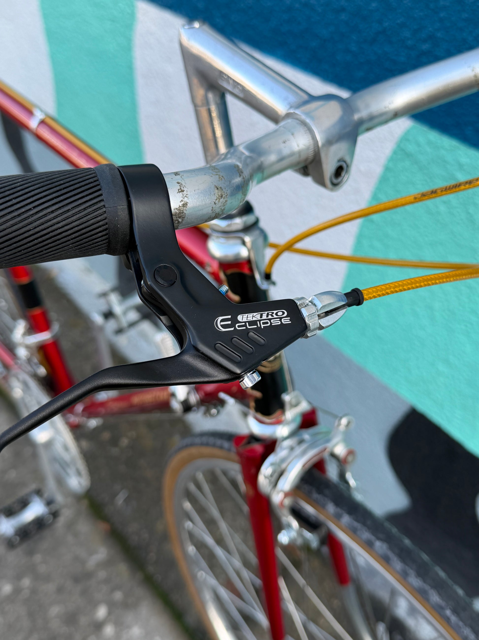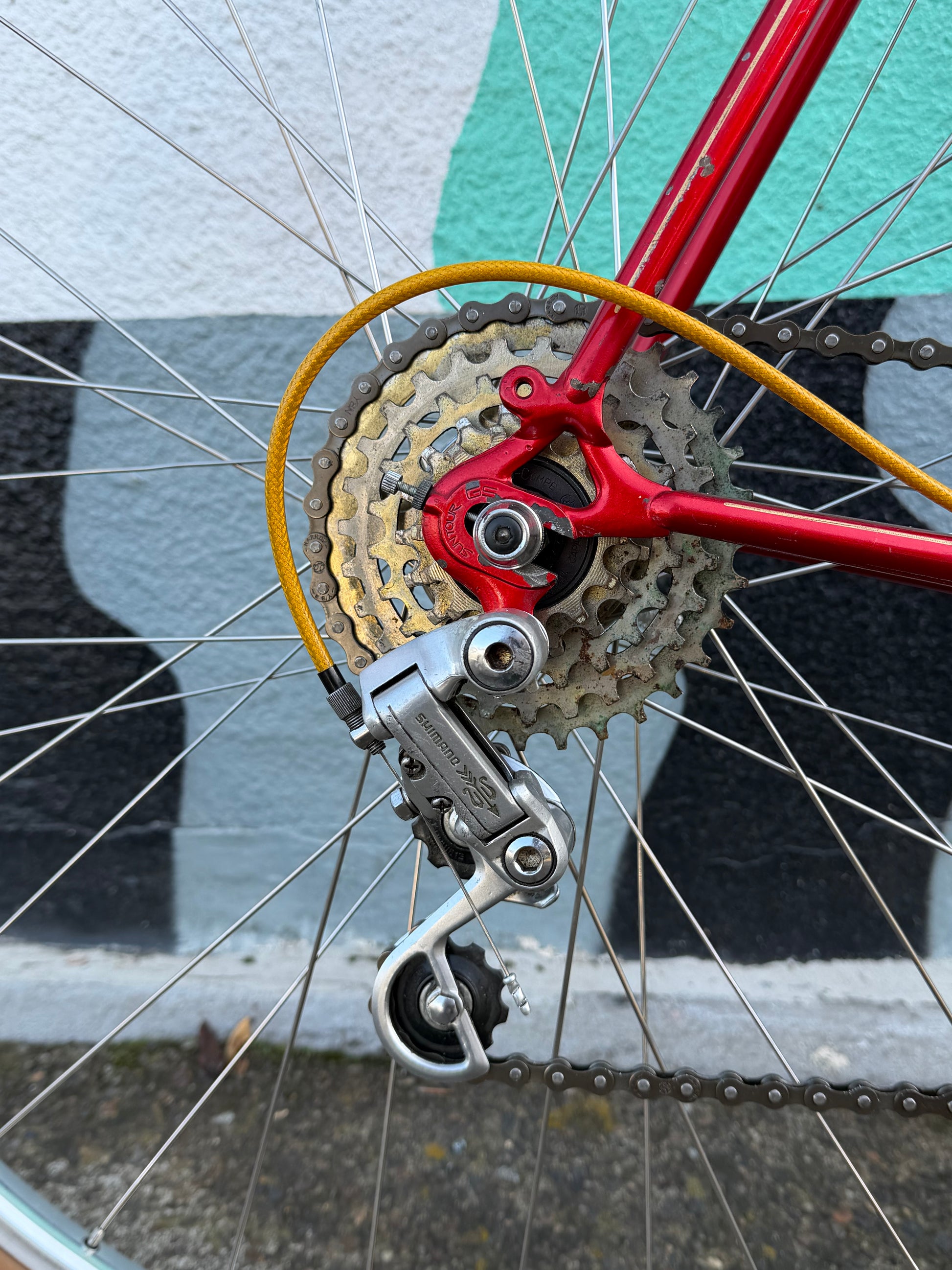 34t suntour freewheel for super low gearing. We used a shimano 600 long cage rear derailleur to work with the gigantic vintage freewheel. Original awesome Suntour downtube shifters. No need to replace them at this time