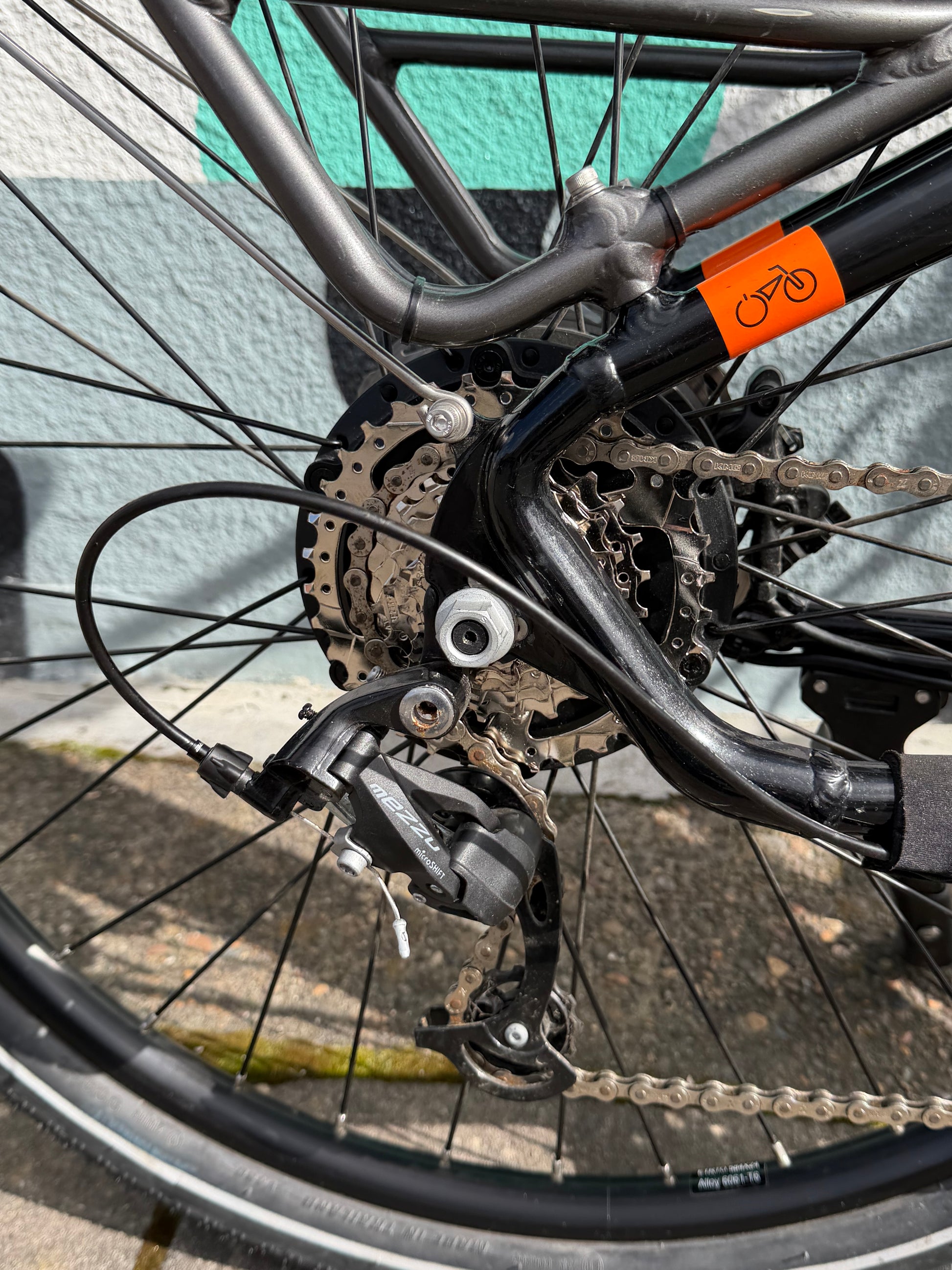 Tuned up hydraulic disc rbakes with 180mm rotors. Hub Motor and drivetrain has very low miles on it. Tires and tubes hold air. Every system has been tuned and safety checked. Controller and display are in good standing.