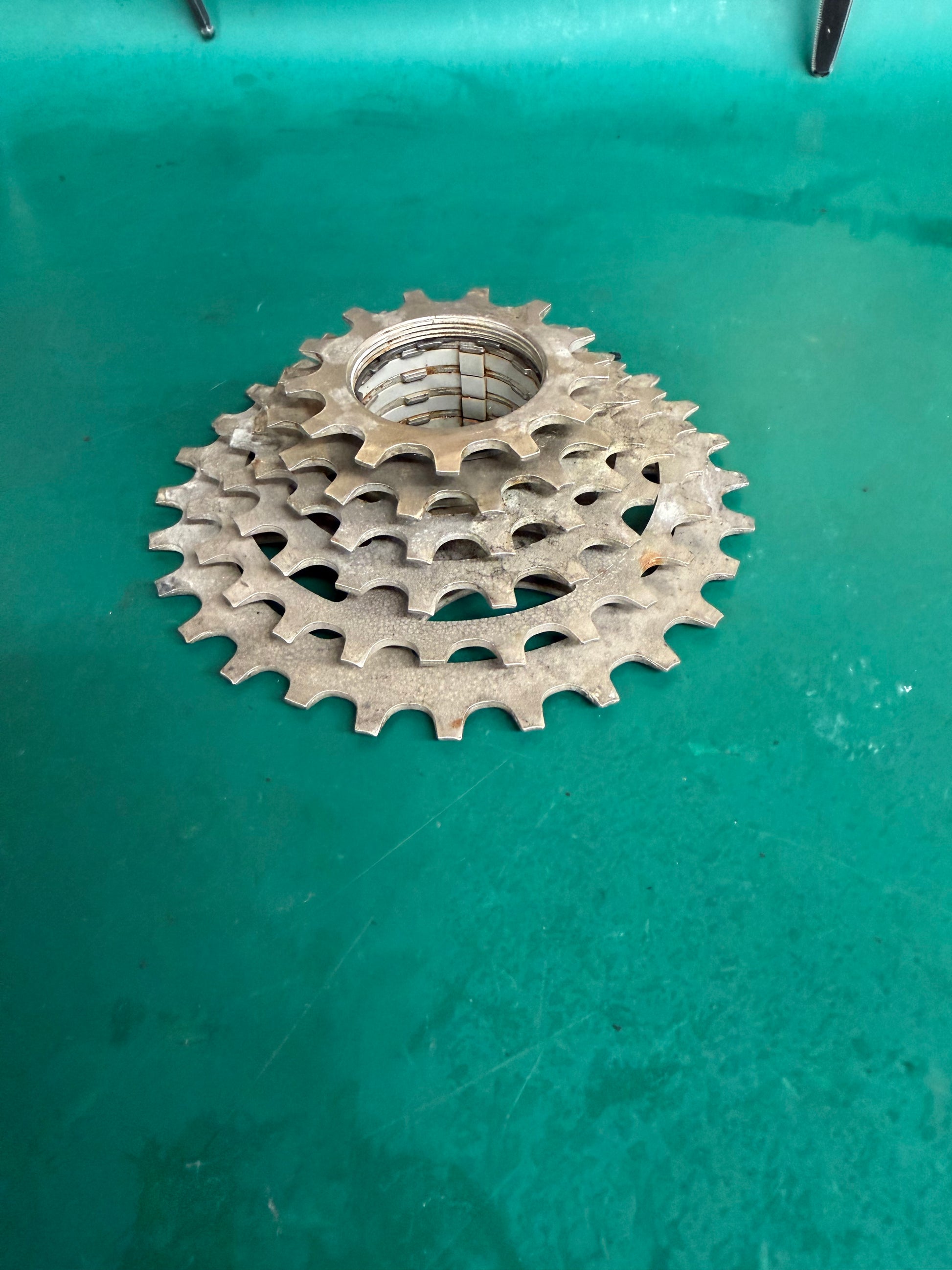 Condition: There is surface rust, some water marks, and possible soot from a literal fire sale. Recovered from a burned down bike shop in Oregon. No box. There is no indication that this cassette was mounted on a wheel or a chain touched it. So it’s old stock, out of box condition.