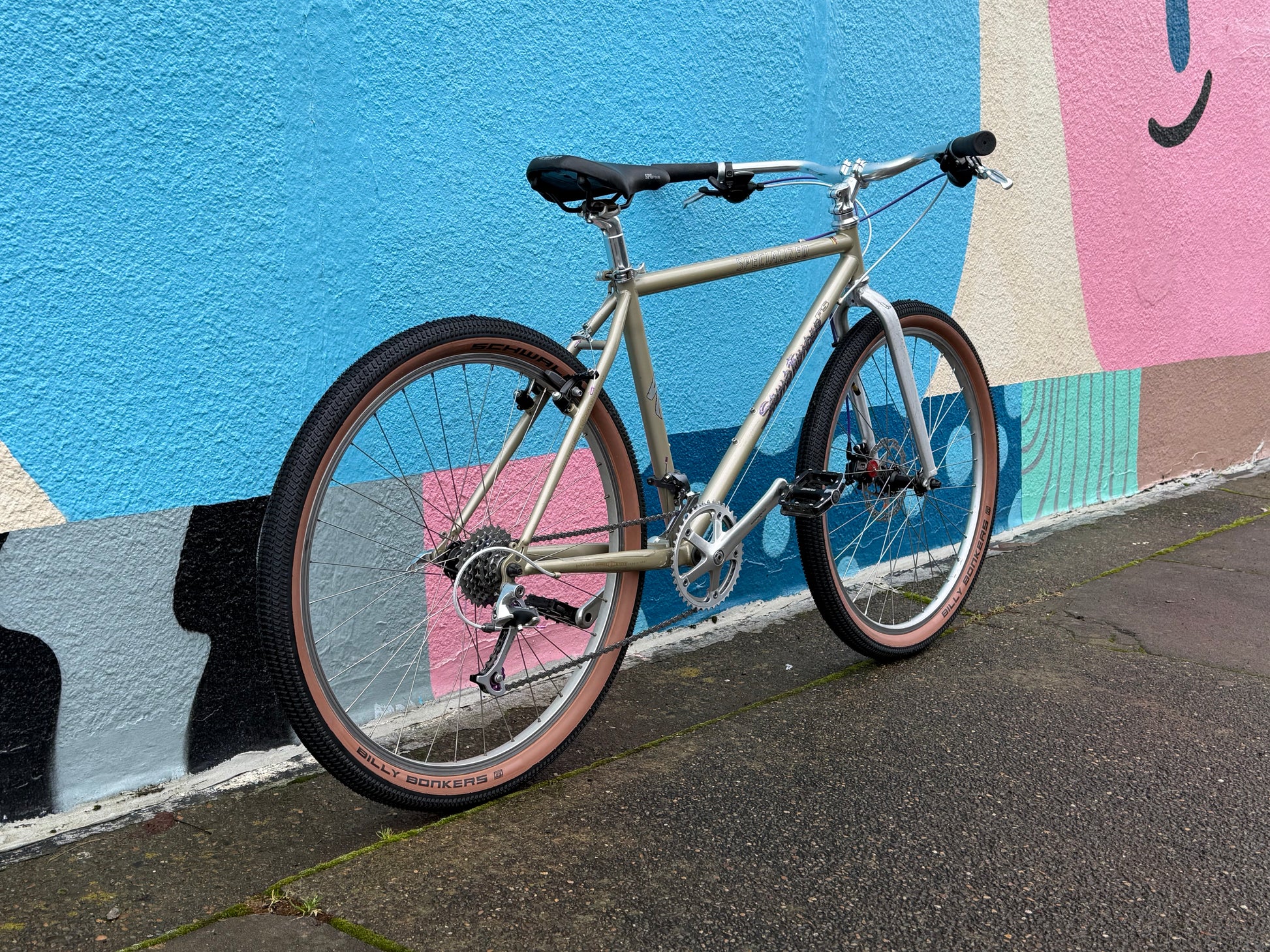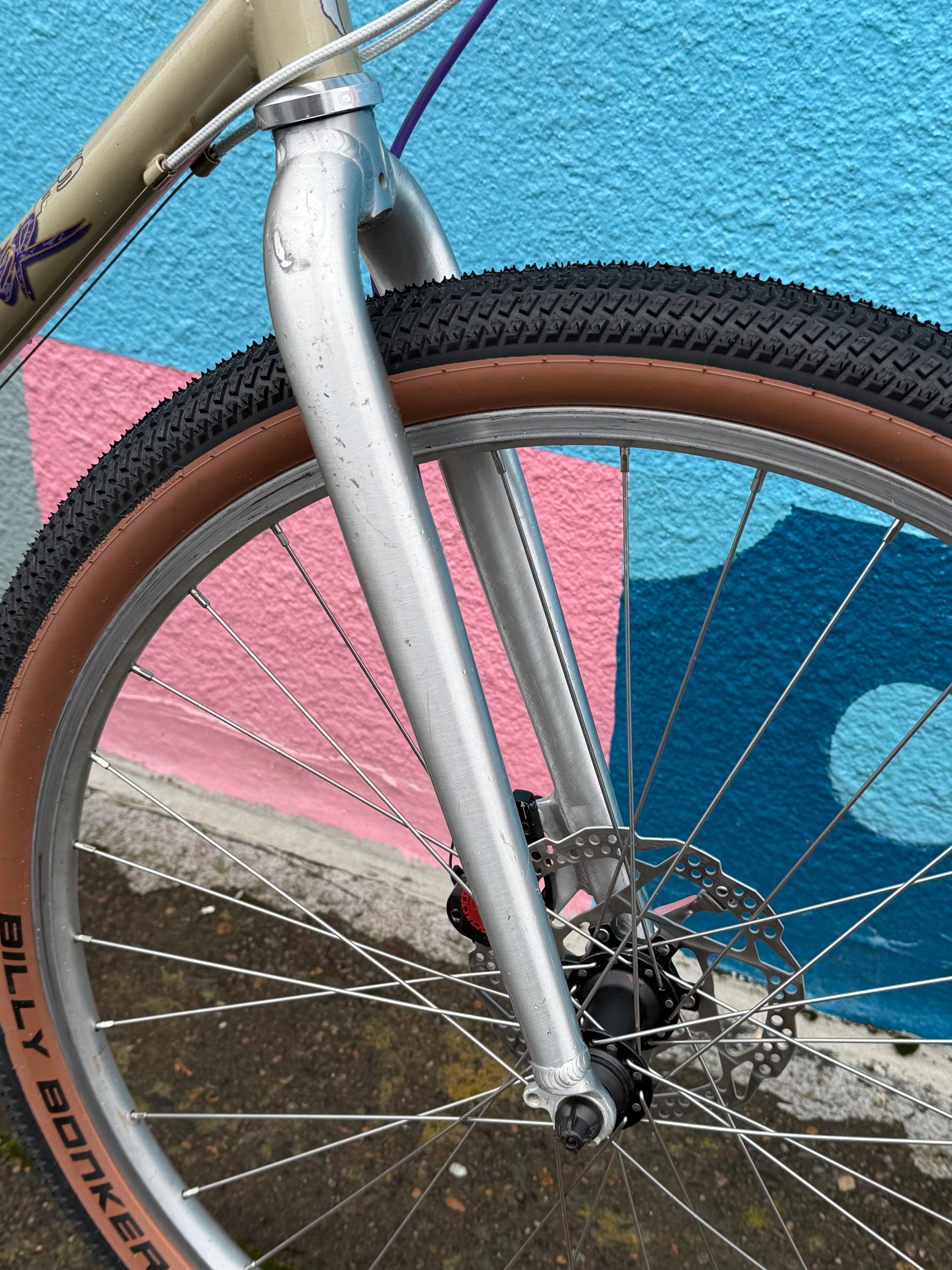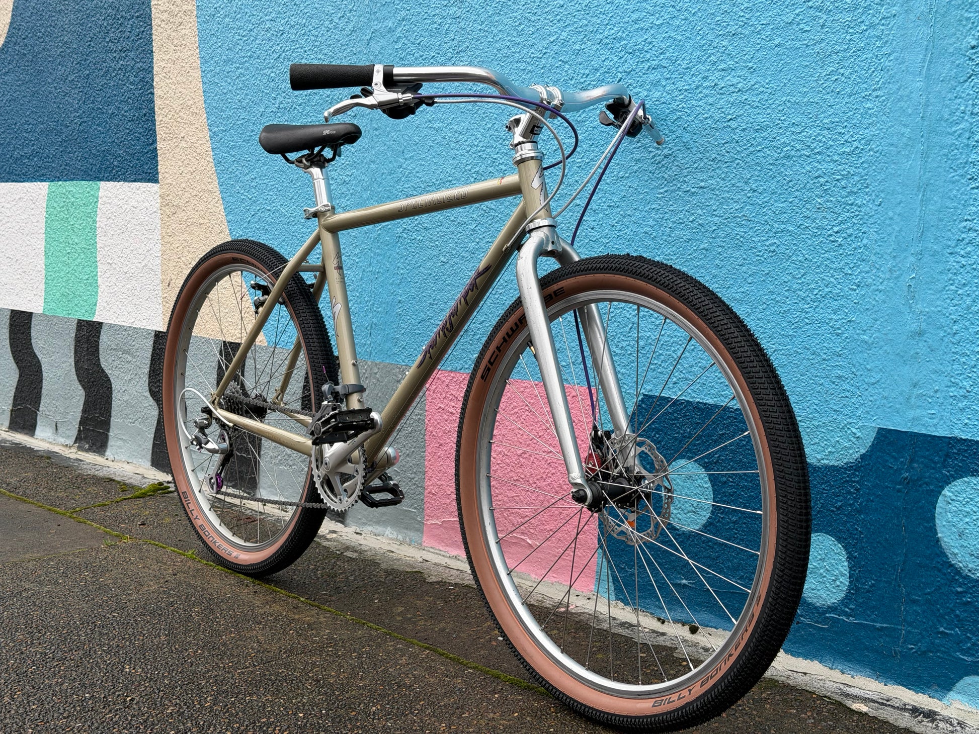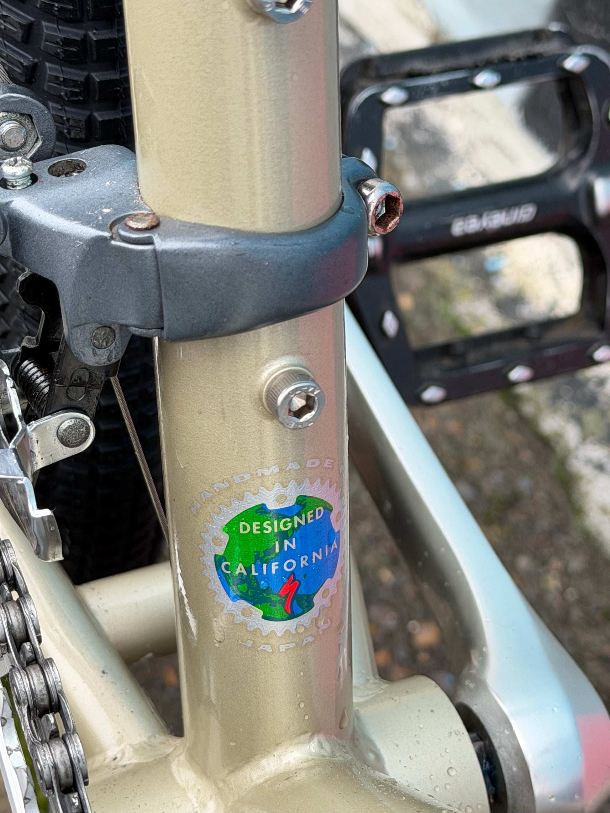 Specialized stumpjumper FS pre-v brake pre-disc brake, so 1993? Origjnal mag21 fork was trashed (anyone want it?). In walks a fine fine disc ready fork. We retained the cool purple pulley XT rear derailleur. Replaced a lotta stuff: crank, bb, wheels, headset, brakes, bar, stem, saddle, tires, grips, pedals, etc. 17” frame with loooong 90s top tube. Champagne color chromoly steel frame. #specializedbikes #vintagemtb #stumpjumper #champagne