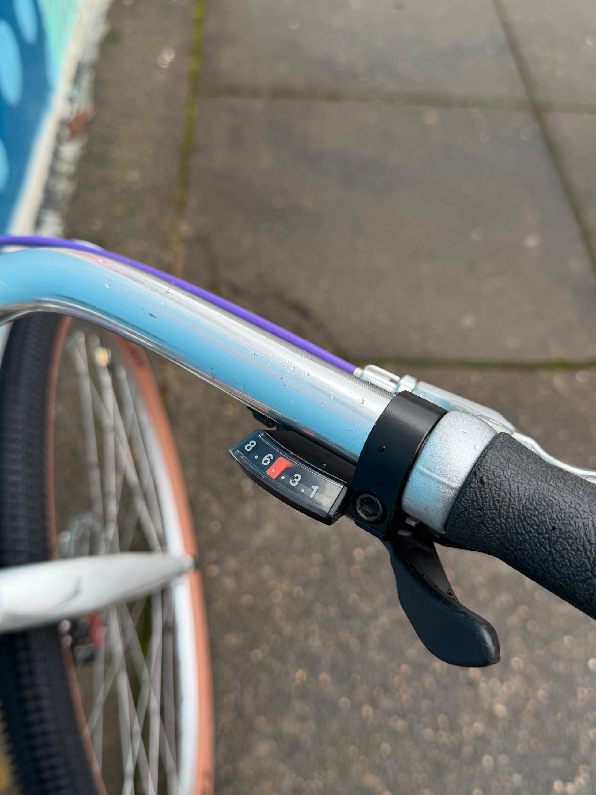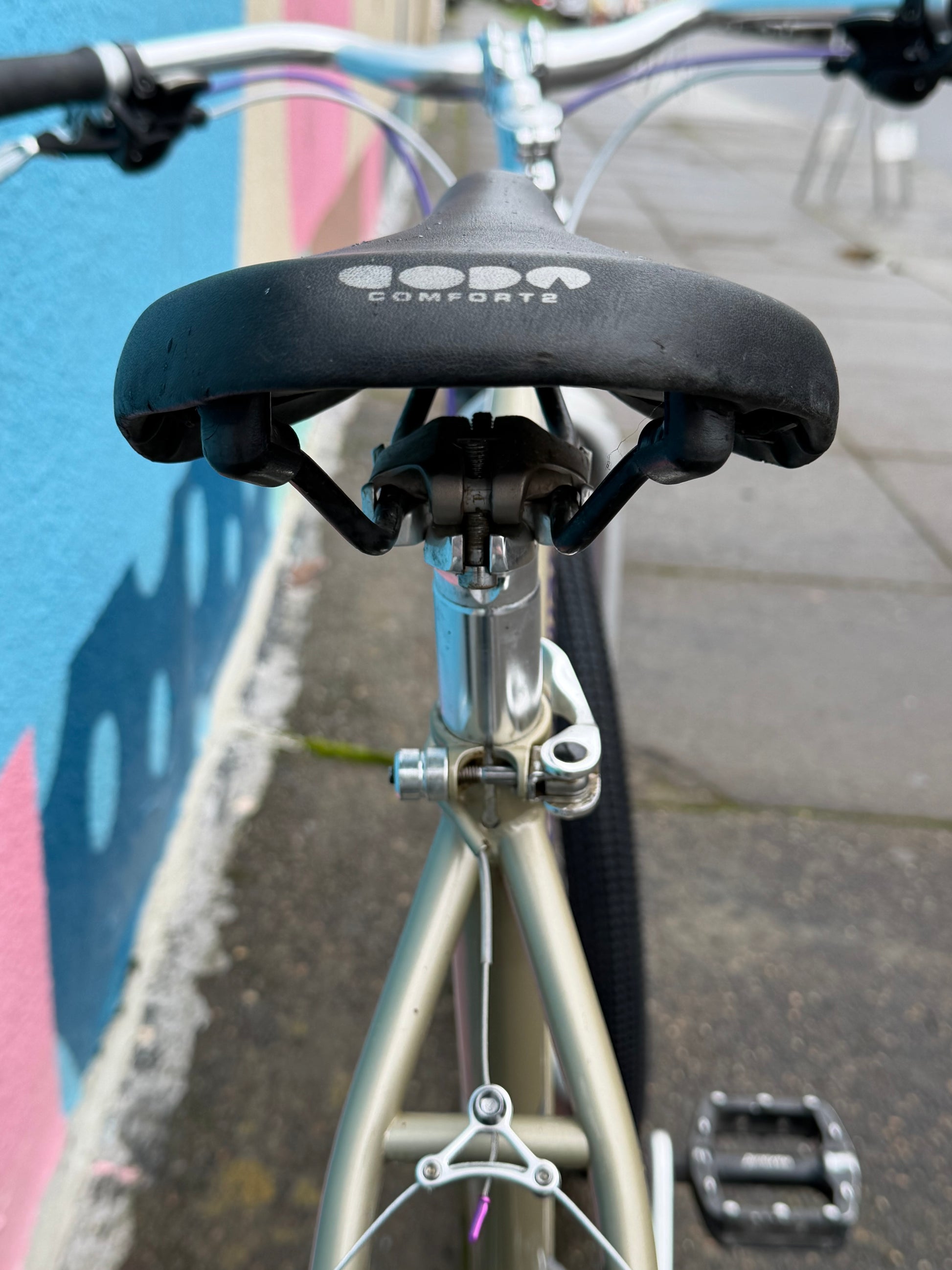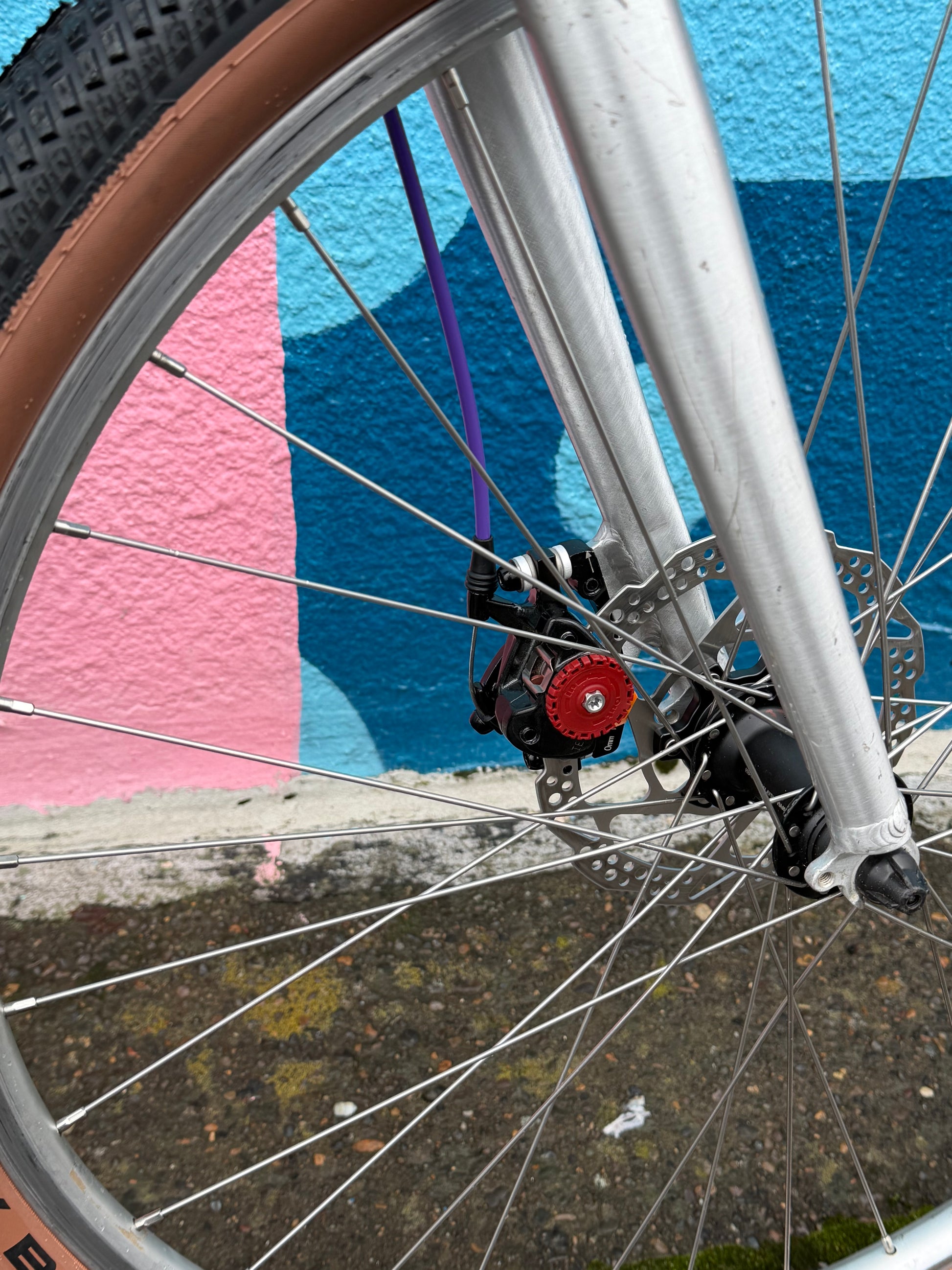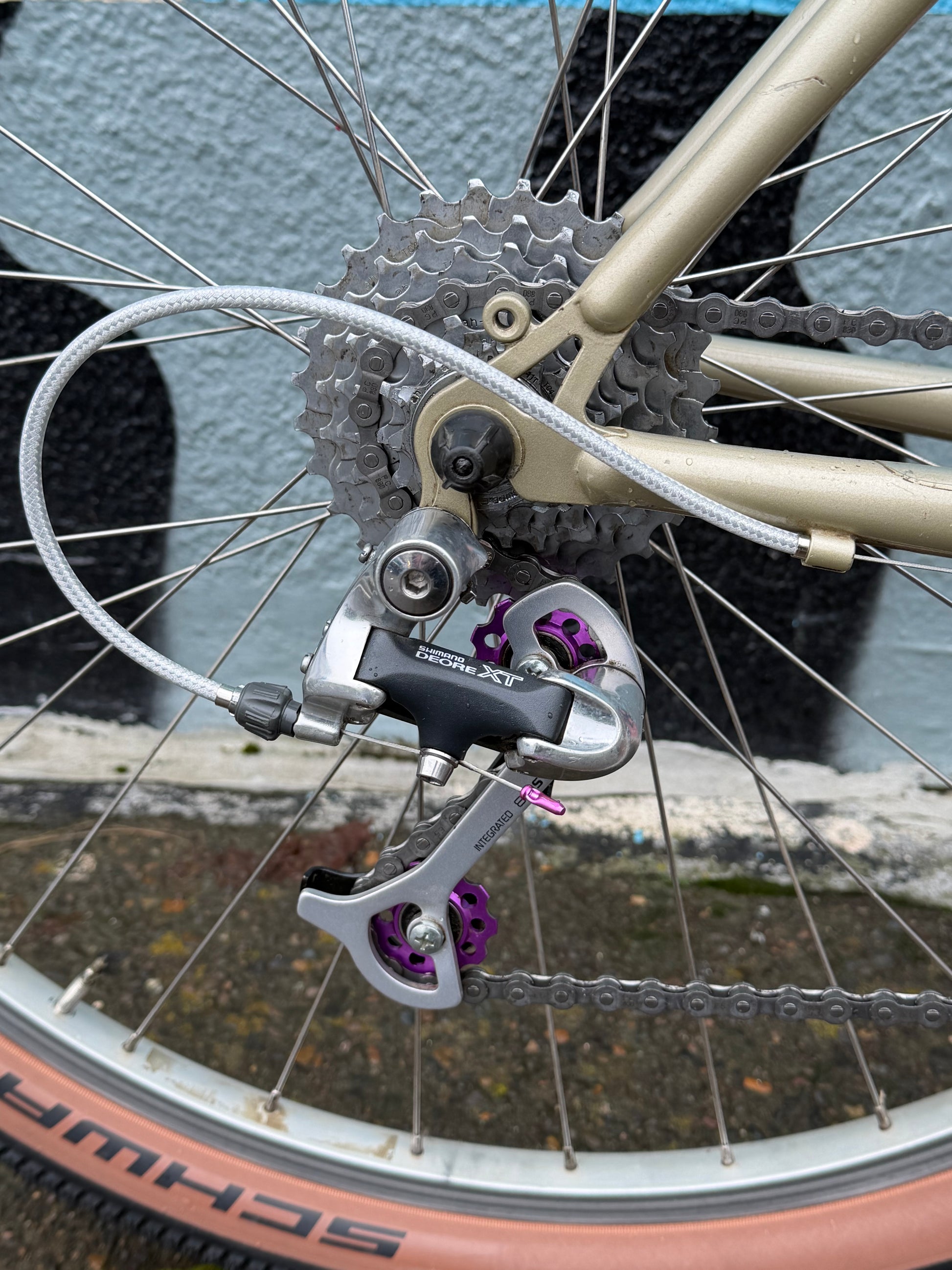 Specialized stumpjumper FS pre-v brake pre-disc brake, so 1993? Origjnal mag21 fork was trashed (anyone want it?). In walks a fine fine disc ready fork. We retained the cool purple pulley XT rear derailleur. Replaced a lotta stuff: crank, bb, wheels, headset, brakes, bar, stem, saddle, tires, grips, pedals, etc. 17” frame with loooong 90s top tube. Champagne color chromoly steel frame. #specializedbikes #vintagemtb #stumpjumper #champagne