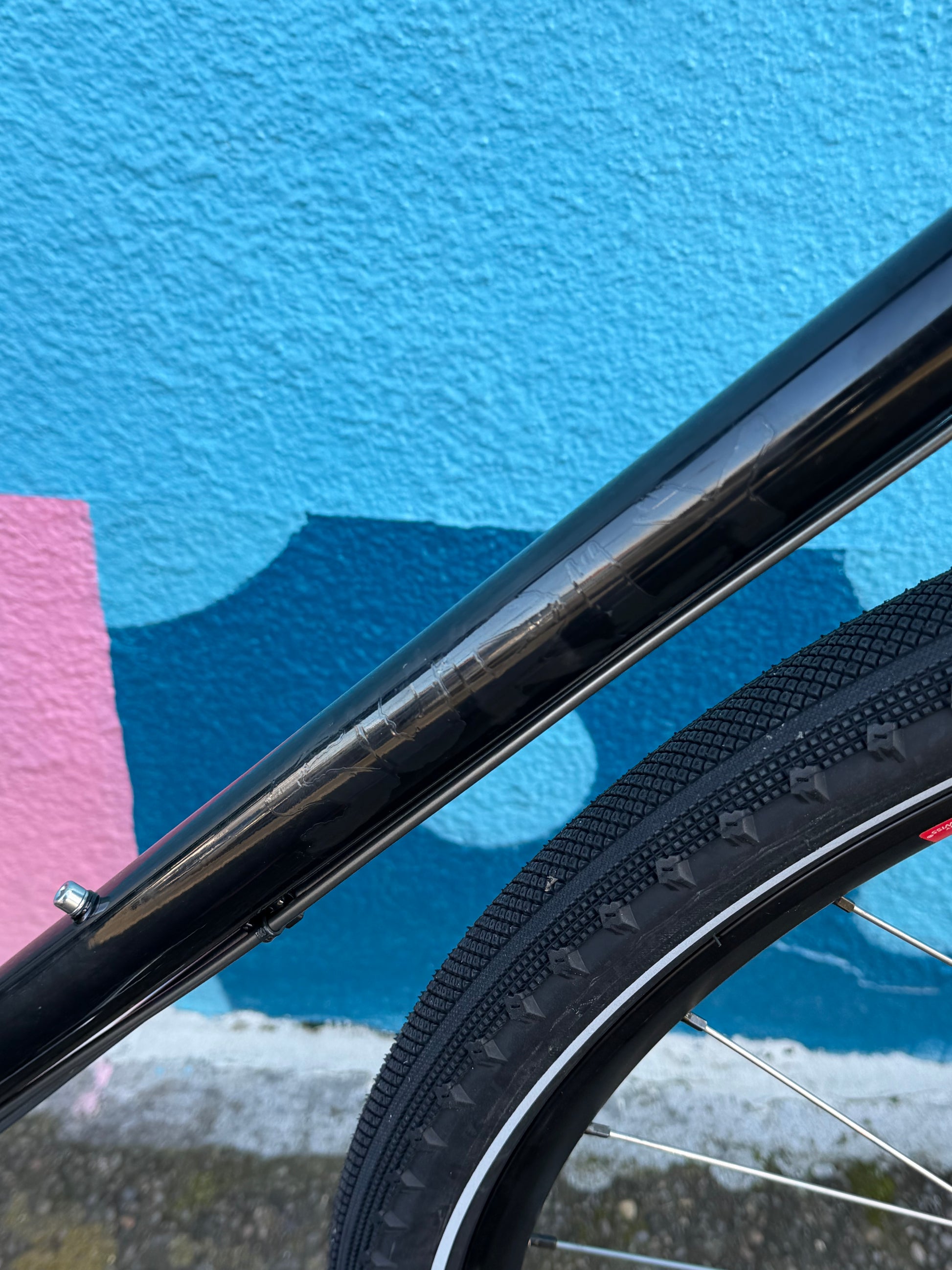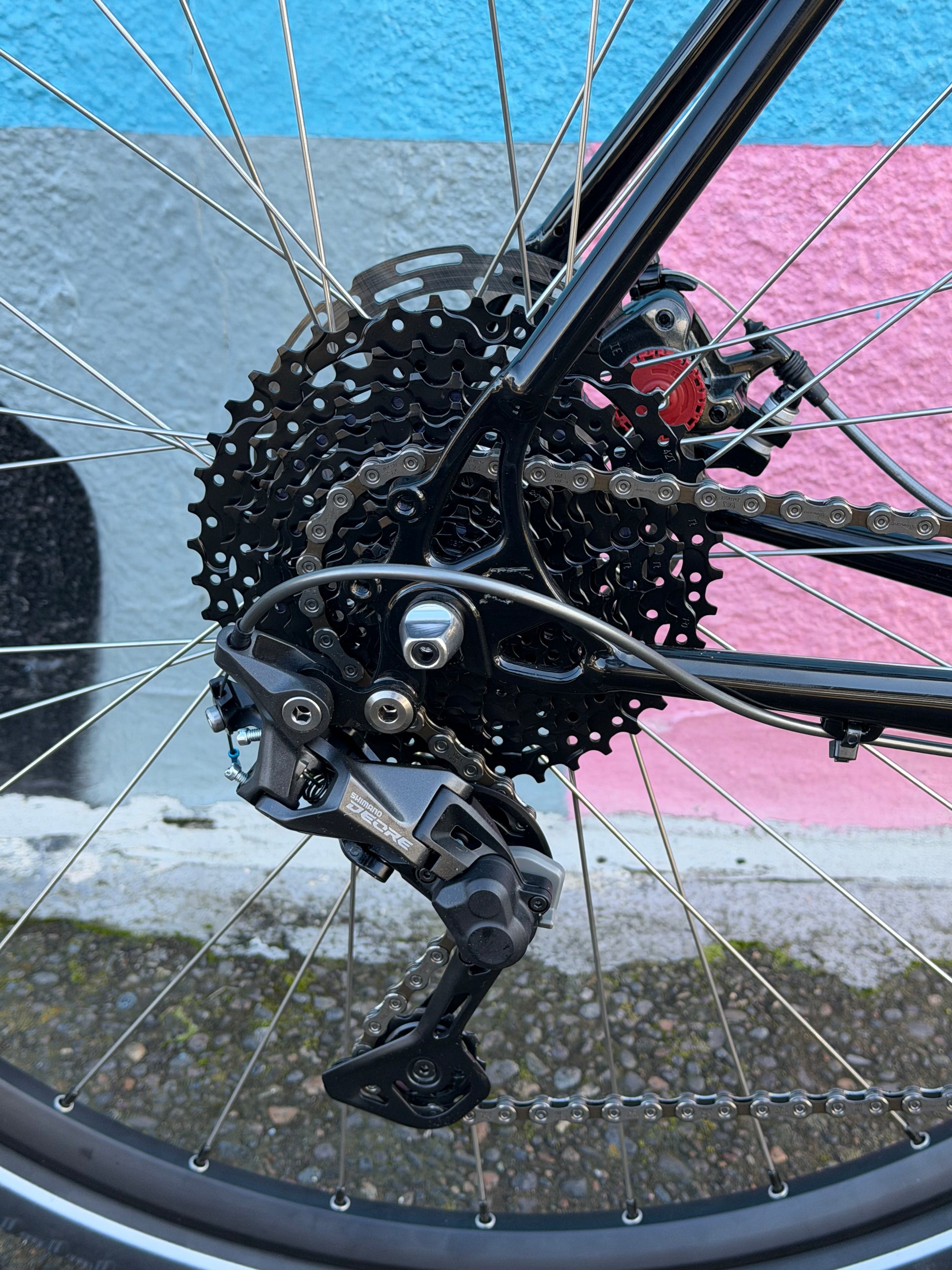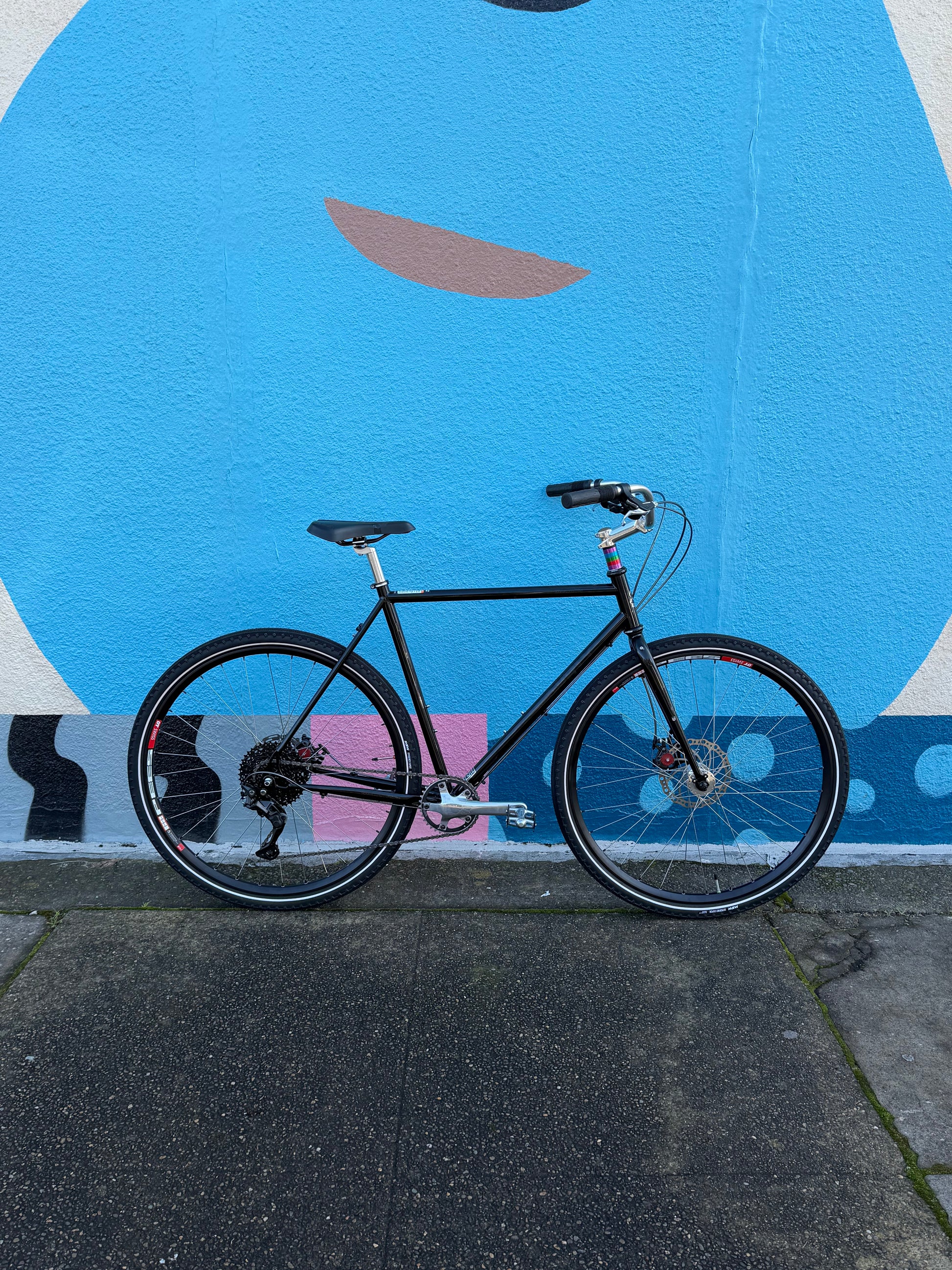 This is a great build with a mix of old and new: Handbuilt in shop wheels with DT 533-D rims on disc hubs, Shimano Ultegra crank with single chainring, Shimano Deore clutch10 speed drivetrain are the highlights. Backsweep bars for all day knocking around comfort anywhere. Blacked out graphics for Top Secret missions.