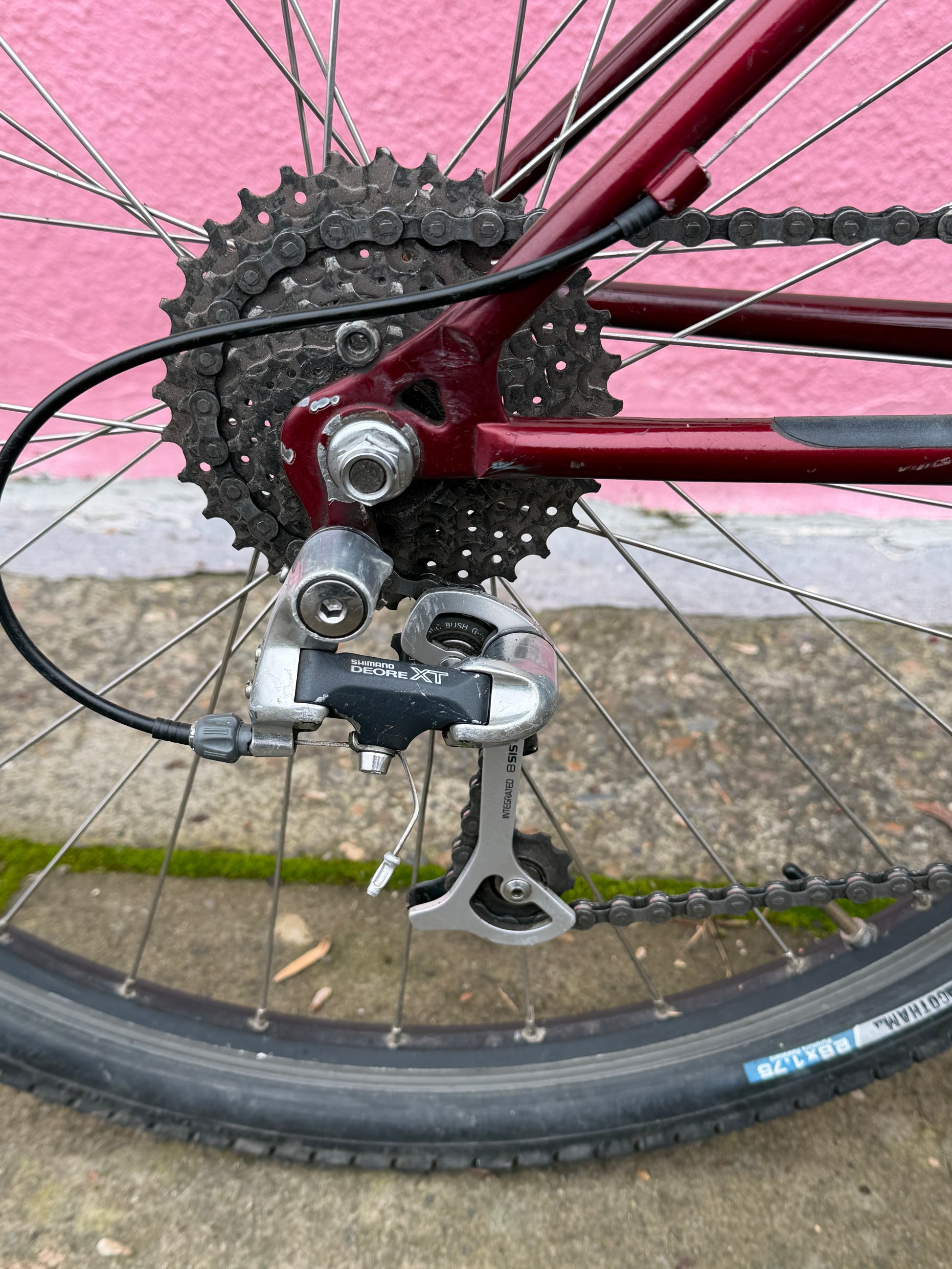 A now vintage mountain bike platform tandem with plenty of upgrades to make it reliable. Great base for further customizations. Chromoly steel Tubeset, made in Japan for Yokota Bikes USA. 3x9 Shimano deore XT drivetrain. Cunningham designed Suntour roller cam brake on the rear and XT v brakes on the front. Avid speed dial brake levers even out the cable modulation for a very similar feel. 26” wheels, Thomson stem, little bits of upgrades here and there.